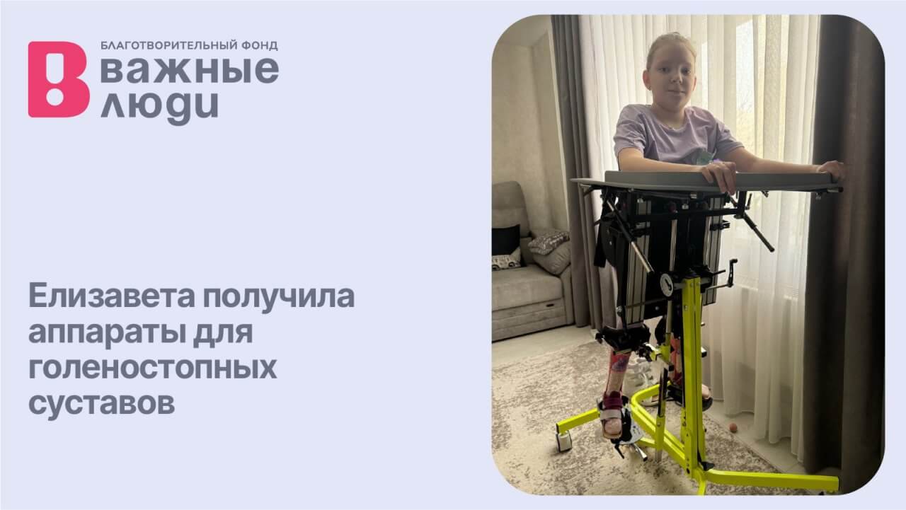 Уважаемый БФ Важные люди, от всего сердца хочу выразить благодарность за помощь в приобретении индивидуальных аппаратов на голеностопные суставы для дочки. Благодаря аппаратам ножки правильно зафиксированы и Лиза стоит в вертикализаторе без боли в голеностопах. Спасибо, всем кто откликнулся, радует, что мир небезразличен к проблемам других людей.