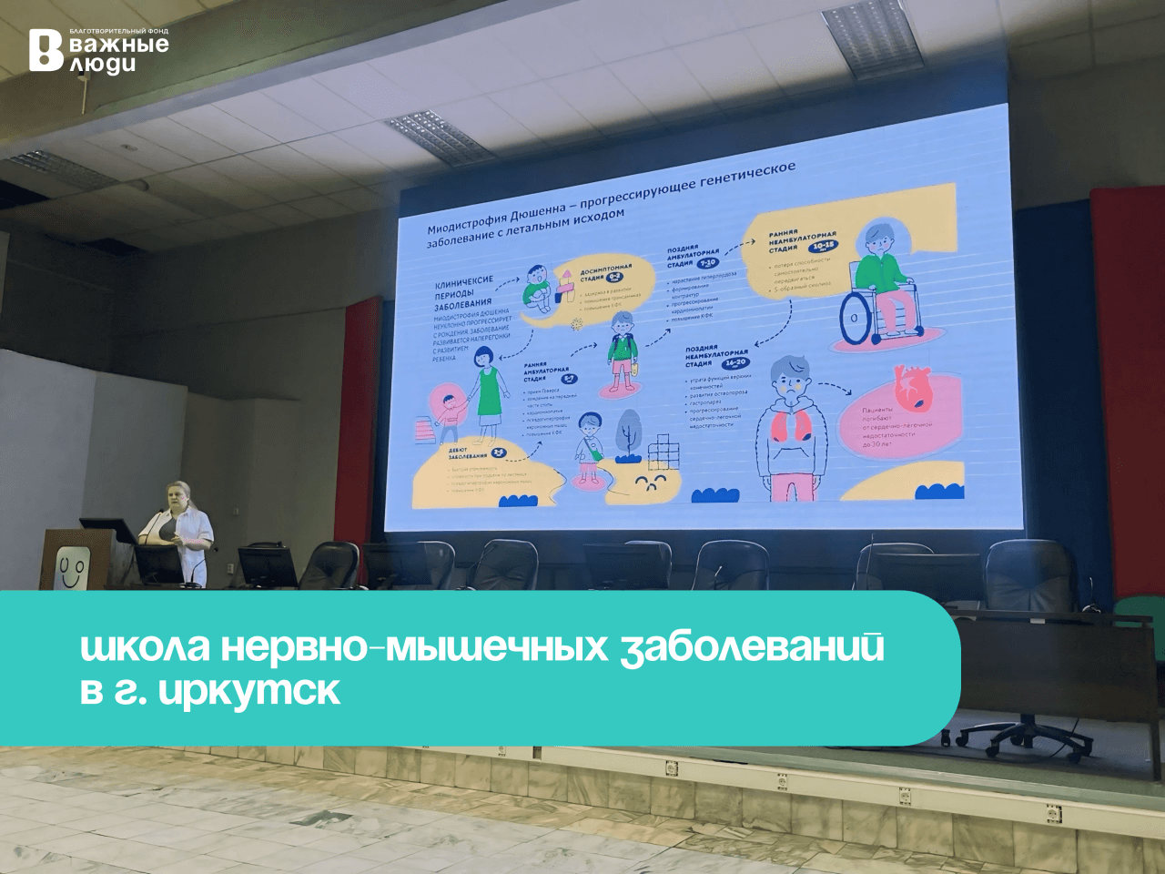 13–14 апреля 2025 года в Иркутске на базе ГБУЗ «Иркутская государственная областная детская клиническая больница» (ГБУЗ «ИГОДКБ») прошла Школа нервно-мышечных заболеваний, организованная благотворительным фондом «Важные люди». Мероприятие объединило врачей региона, родителей и экспертов федерального центра г. Москвы для обмена опытом и повышения качества оказания помощи детям с миодистрофией Дюшенна и спинальной мышечной атрофией (СМА).