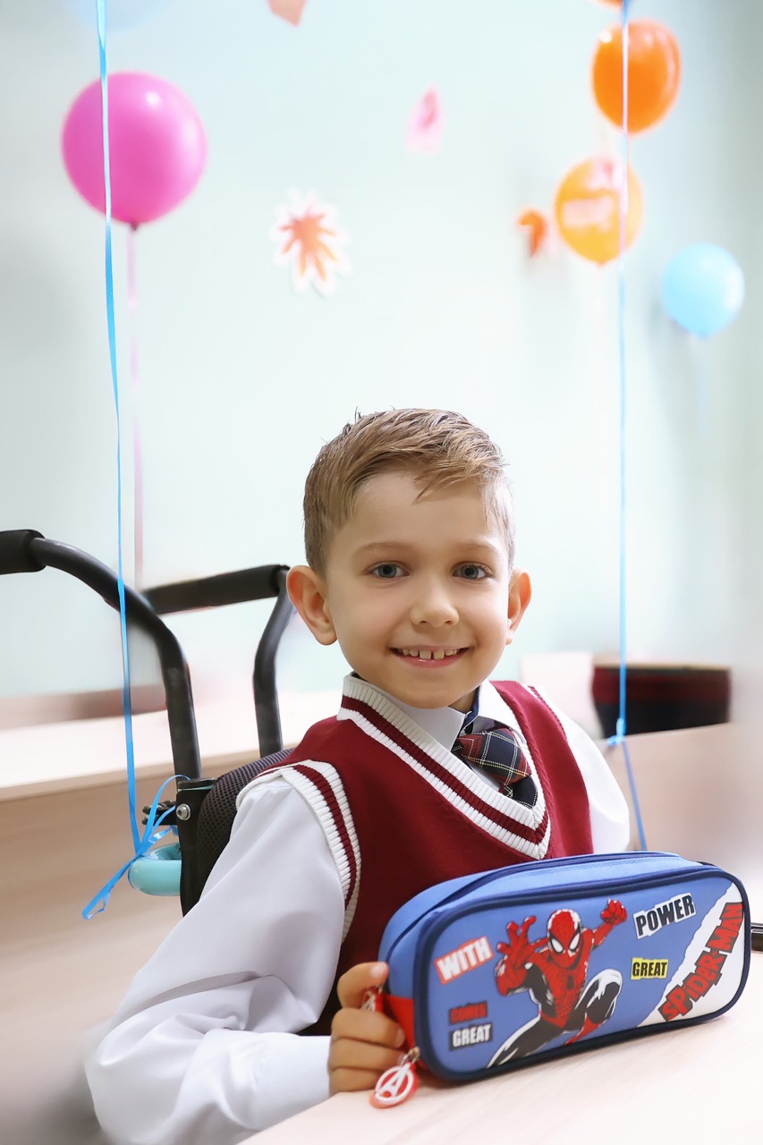 У Андриана спинальная мышечная атрофия. После школы каждый день он занимается, чтобы развивать мышцы и становиться сильнее. Благодаря упорству Андриан уже уверенно сидит, ползает и даже делает первые шаги.